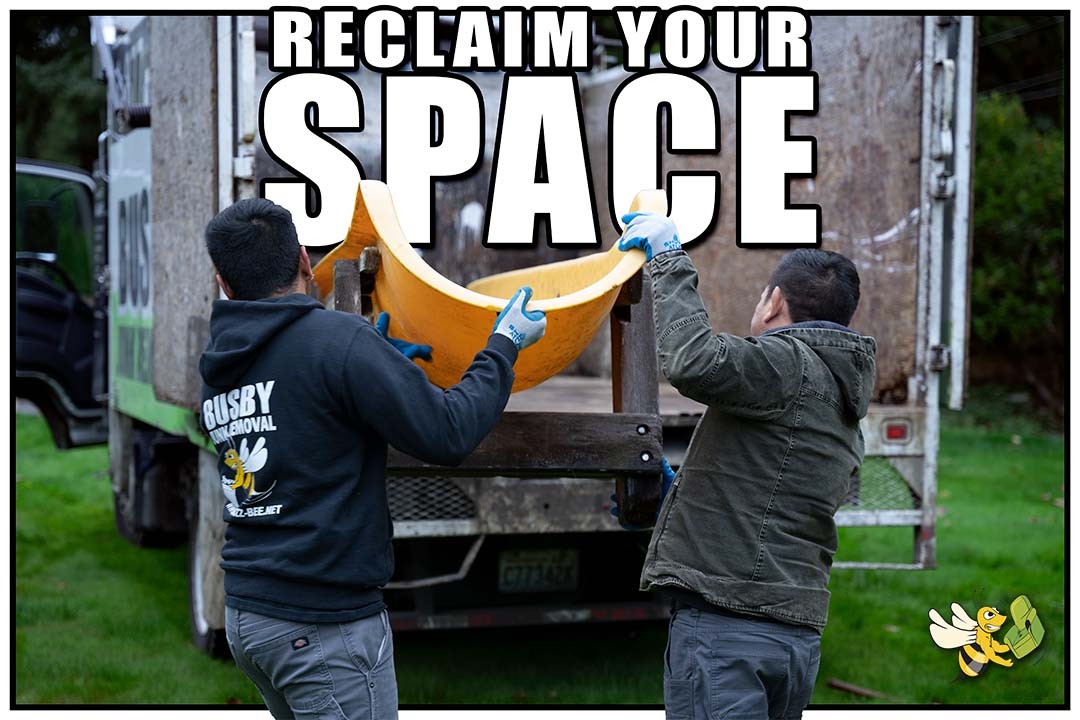 On demand, same day service. We are a locally owned and operated, family run business. We will pick up just about anything that is not considered hazardous, such as: garbage, recycling, appliances, furniture, yard waste, electronics, concrete, brick, dirt, wood, metal, construction/demolition waste, etc. Busby is a full-service junk removal company, meaning that we not only load and haul your junk away for disposal - we also provide all the necessary labor to remove and dismantle whatever it is you need taken away, from wherever it currently sits. We have around a 73% diversion rate for general waste and follow BuiltGreen guidelines for recycling construction waste. We are readily available for regular renovation and construction debris pick-ups so you can keep your site looking pristine. We are also a certified collector with the state electronic waste recycling program called E-cycle Washington. Besides hauling we can demolish hot tubs, sheds, boats, and small structures safely and efficiently. Pricing is based on the volume of the truck that you fill up with some additional surcharges on things like paint, freon units, fluorescent lights, pianos and tires as well as a separate rate of $200/cubic yard for heavy material such as concrete/dirt. Our crew members provide no obligation, up front pricing on site so you always know what to expect before we start loading your junk items into our truck. Our focus is on customer service and local sustainability,