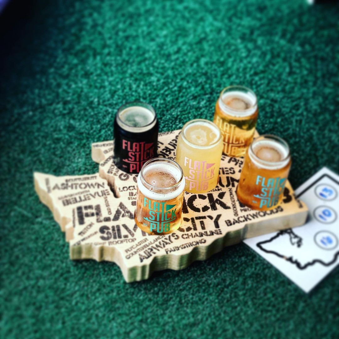 There are only two rules at Flatstick Pub: drink local and have fun. Flatstick was inspired by an idea to create a casual beer focused pub that featured a unique and challenging miniature golf course. We’re passionate about craft beer and supporting our community. From day 1 we have only offered beer from independent breweries located here in the great state of Washington. You’ll never find corporate beer here. We love to have fun, drink beer, and play games. In addition to mini golf you’ll find original golf themed games invented by us at Flatstick. Duffleboard™, Ball Jockey™, and ‘stick putt!™ are three of our new creations that you won’t find anywhere else. Who knows what we’ll come up with next. Whatever brings you in: first date, delicious beer, team building event, adult birthday party, watching sports, happy hour, or to challenge your friends at a game, our goal is to provide a place where everyone feels welcome to relax and have a great time.