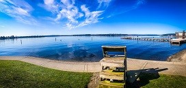 Doris Cooper Houghton Beach Park lies between Carillon Point and downtown Kirkland along Lake Washington Boulevard. The park provides a perfect resting spot for joggers or a lovely walking destination from downtown Kirkland and boasts a swimming beach, kayak put-in and volleyball court, with stellar views of Seattle and Lake Washington.