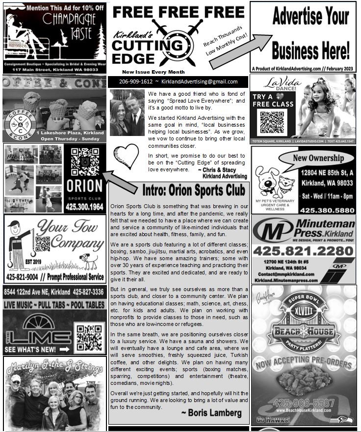 We are a locally owned and operated Advertising Agency that publishes the Kirkland's Cutting Edge, a local periodical. Every month we create, publish, and personally distribute two thousand copies throughout the city of Kirkland. From Kingsgate to Carillon Point , Juanita to Totem Lake... we help local businesses connect to our community.