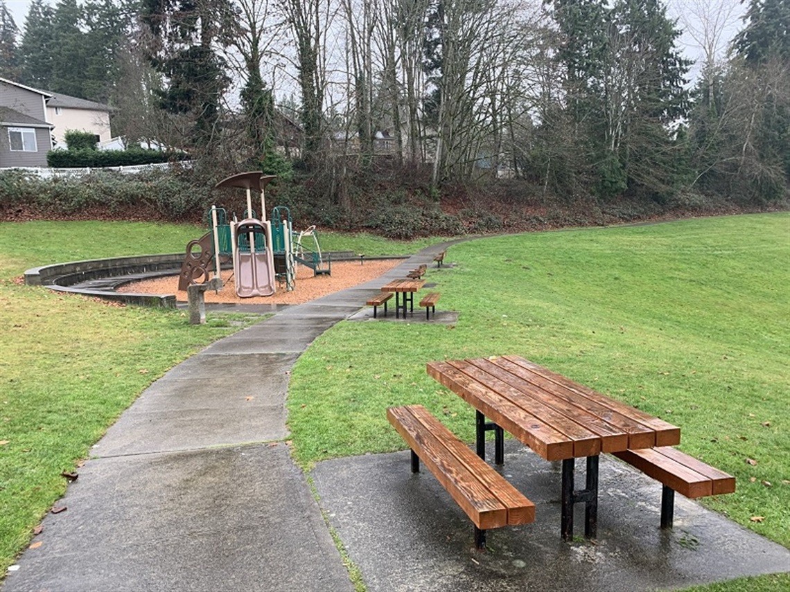 Spinney Homestead Park is a neighborhood park featuring a playground, picnic tables, and a large open field. A portable toilet is available from approximately March through October. A parking lot is available at NE 100th St and 117th Pl NE.
