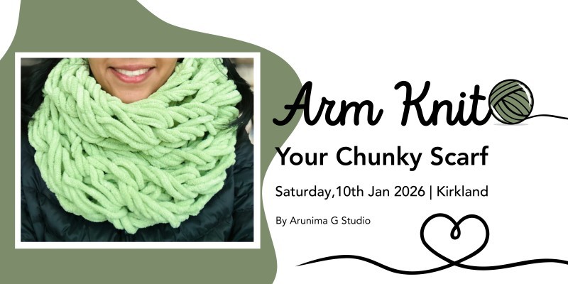 In this cozy, beginner-friendly workshop, you’ll learn how to arm knit a chunky scarf – no needles, no prior knitting experience, just your arms and some yarn.