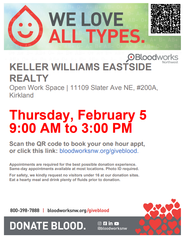 Home Keller Williams Blood Drive February 5, 2026 Share Keller Williams in Cooperation with Bloodworks Northwest is hosting a blood drive on February 5th. Website Email Save Keller Williams Blood Drive11109 Slater Ave NE Kirkland, Washington 98033 United StatesDetailsOpen in Google Maps Map Add to calendar: Outlook Calendar Google Calendar Save Address 11109 Slater Ave NE Kirkland, WA 98033 Phone (425) 285-3203 Admission Free