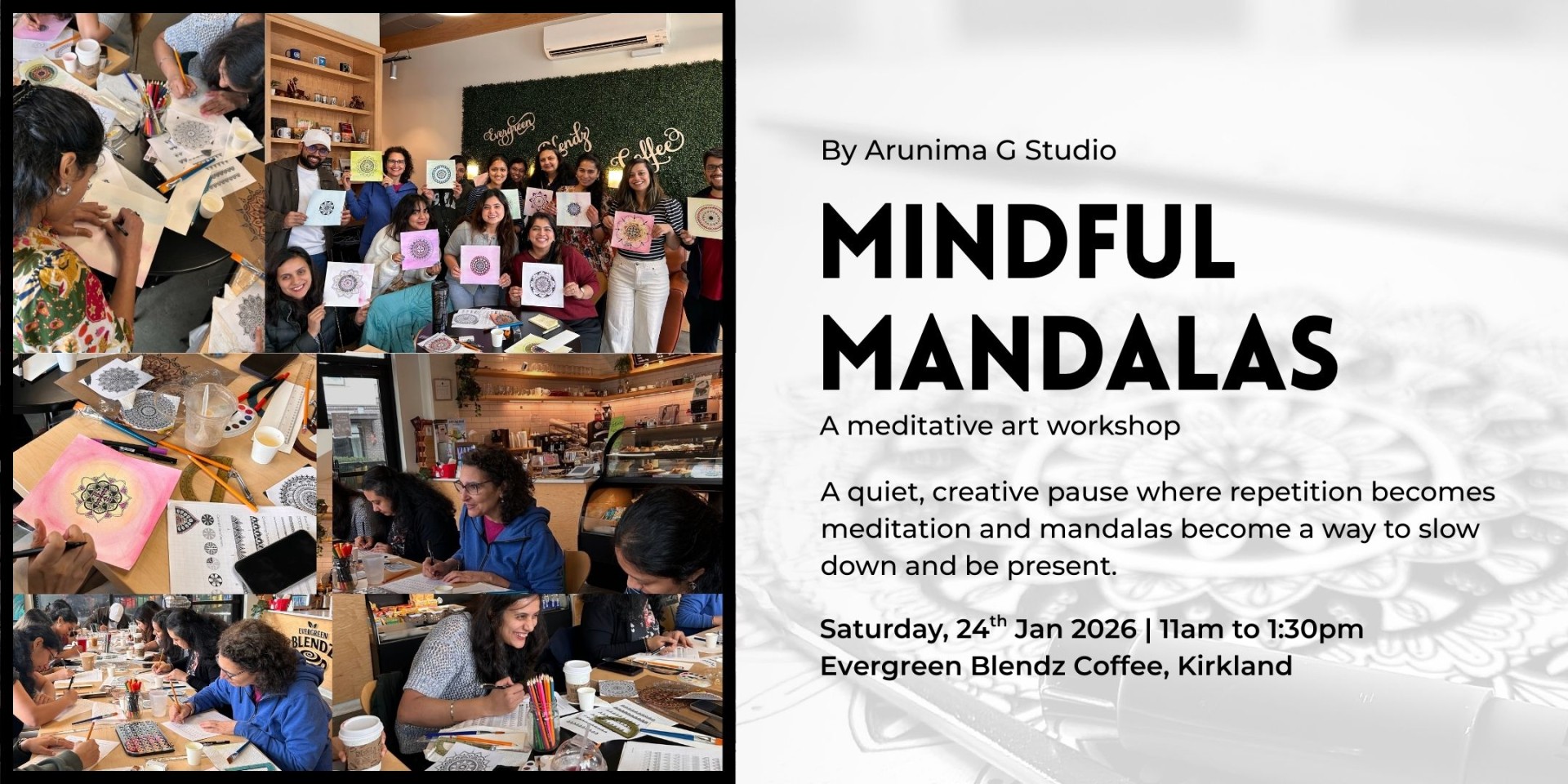 Mindful Mandalas is a relaxing and meditative art workshop designed to help you slow down, unwind, and reconnect with your creative side. Set in the warm, cozy space of Evergreen Blendz Coffee, Kirkland, this workshop invites you to experience mandala-making as a mindful, calming practice, no prior art experience needed.